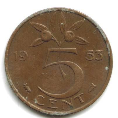 Yes, it's from the Netherlands. Twelve million made (compared to over a billion for US 1953 P-D-S cents). It's bronze, which is copper plus tin and possibly zinc, phosphorus, etc.