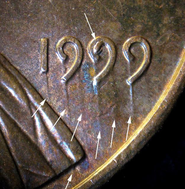 I would like to congratulate the following people; Joshua for having 19 new DEO / DER discovery dies. Coop for a nice new 2007 Lincoln cent, wavy step from Denver, listed as 2007D-1DER- 001WS and finally Tery, who found this very strong obverse trail die now listed as 1999P-1DEO-007T. This one is so strong that it can be seen without magnification.