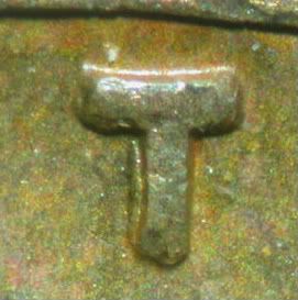 Teri, look at the gteen "T". Notice it is "sitting on a very flat surface? It looks as tho it has been moved slghtly downward, but mostly to the right. that flat shelf-like area is what gives it the name, "shelf-doubling", or MD, Machine-doubling. It was done with a lateral movement, as apposed to the doubling, IN the working die.. The motion is vertical with hub doubling, BUT, the doubling is already in the die! MD is always lateral and is not present until after having been struck. If you could look across the side, and flat surface, you would note that the part of the letter, (in this case, is a hair HIGHER than another identical letter. This is due to the compression, lateraly. THis is generally true for most MD, however, in extreme cases, the letter will be wider, but very noticably so. You cant miss that type. Look at these:
