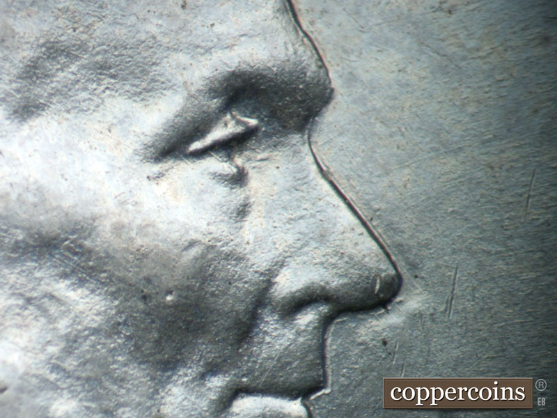 E/W die scratches cover reverse, see photos for exact configuration. Die crack from rim through L in PLURIBUS to O in ONE. Die gouge in C of AMERICA. Die gouge in O in OF. Die crack connects O in ONE to E in CENT.