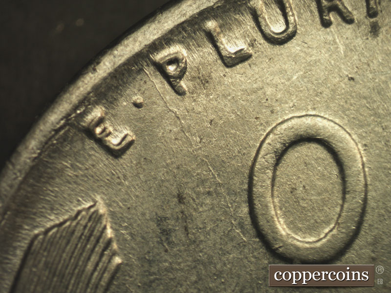 Die crack heading NW from lower O in ONE to rim. Die crack starting at E in STATES running east through right wheat stalk to rim. Die crack though OF through left lower wheat stalk to rim. Die break lower T in CENT.