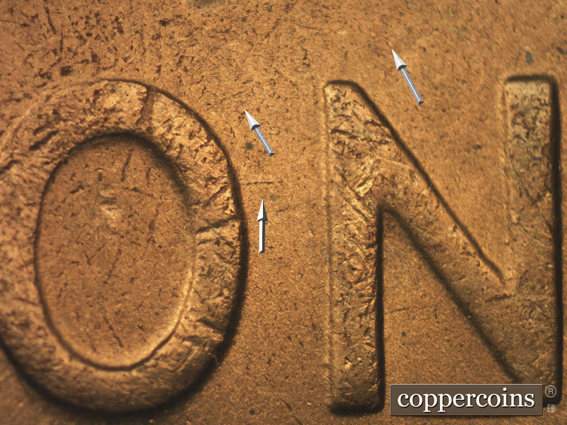 Die gouge between UR in PLURIBUS. NE die scratch from upper O in ONE. Die gouge next to first U in UNUM. Die break on lower T in CENT. NW die gouges under upper leg of E in CENT. Concentric die scratch between right wheat and rim.