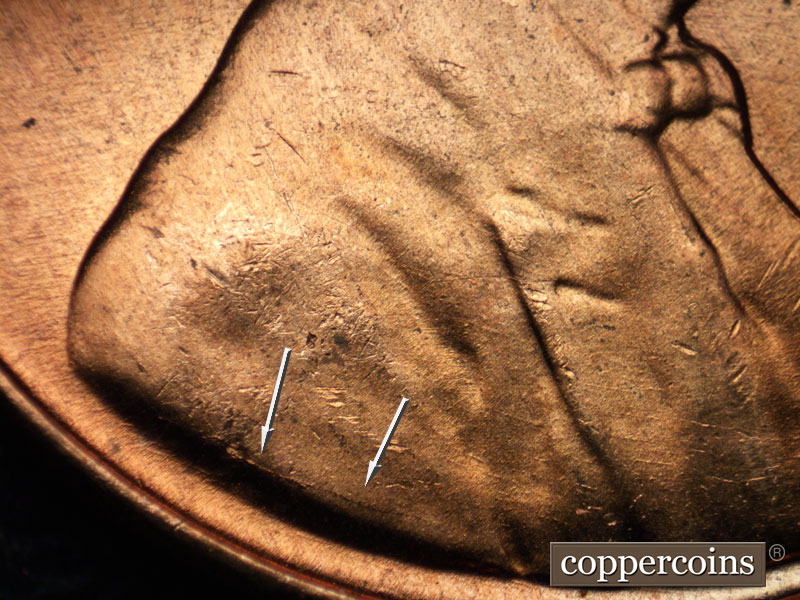 Multidirectional die scratches through date. Generally E/W die scratches across upper half of the obverse. Strong die NW die gouge on neck. Two SE die gouges on temple. Reverse is EMDS
