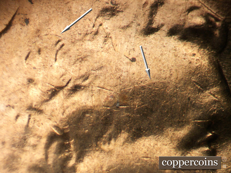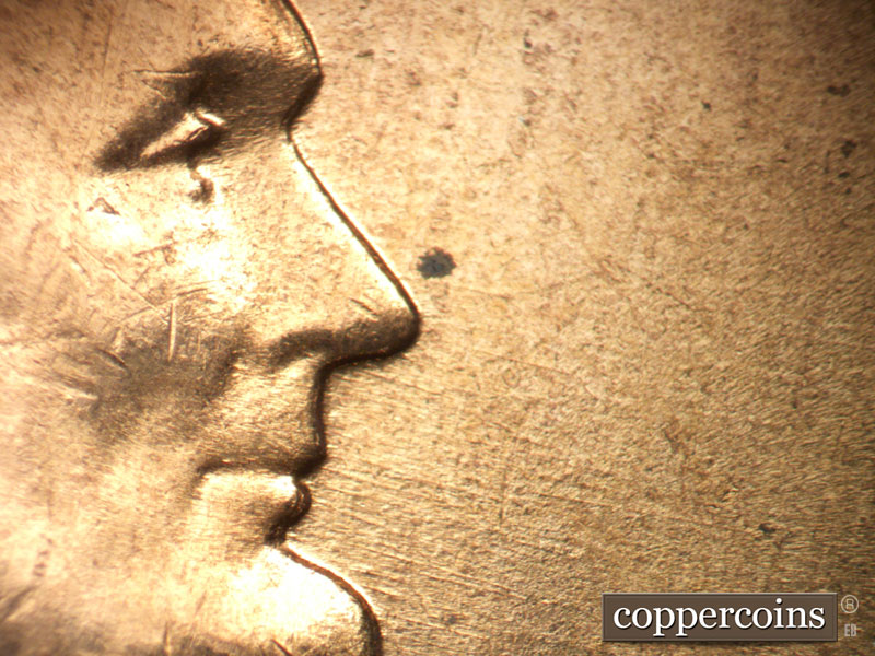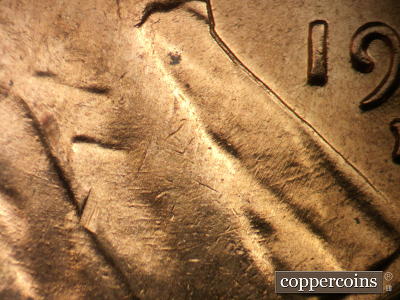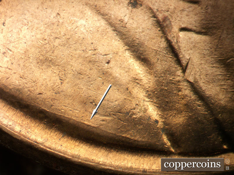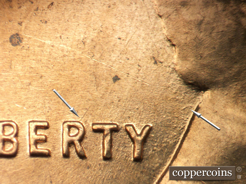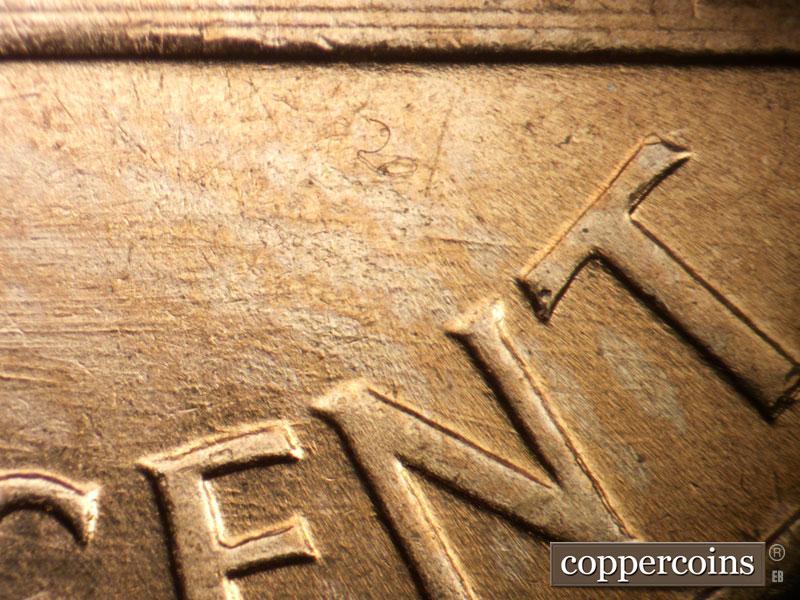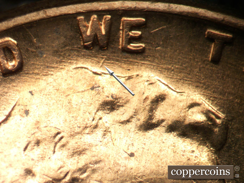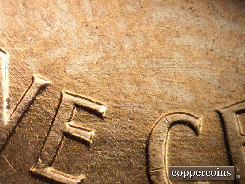 Die crack above VDB. NE die scratch from top of R in LIBERTY. Die pitting behind neck. NE die gouge from top of har to W in WE. ESE die scratches from mouth. light die cracks in hair and on forehead. Reverse is EMDS
