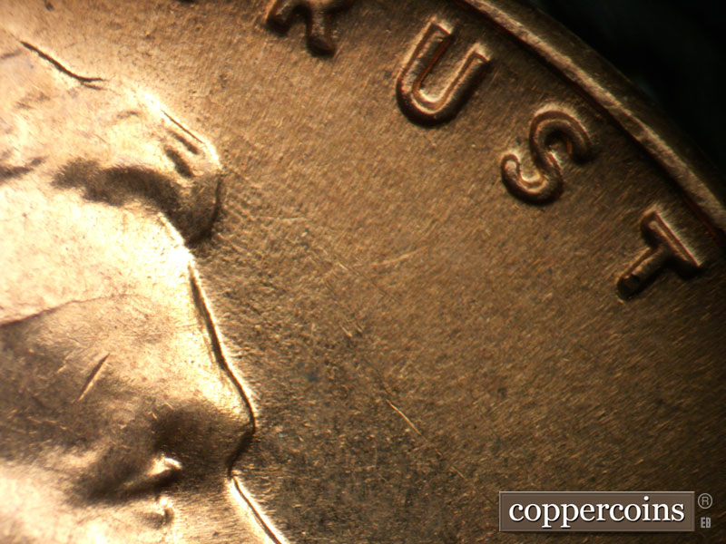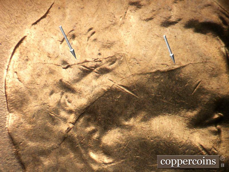 SE die gouge from bowtie. Die crack on shoulder Die chip fill lower B in LIBERTY. SE die scraches from front of hair. Die cracks in hair and across forehead. Reverse is MDS