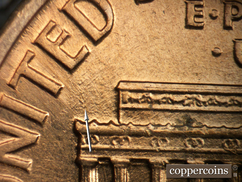 Worn die scratches between TE in UNITED and left roof/cornice. SE die scratches under first A in AMERICA. Die chip on right cornice. Die crackin down column 1. SE die scratch in O of ONE.