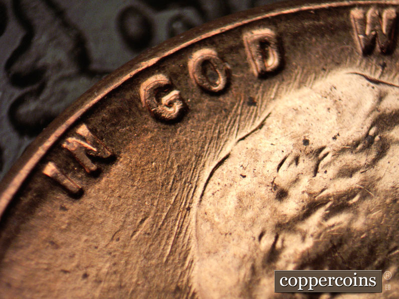 Generally NE worn die scratching through 196 of date. Worn SW die scratches behind shoulder. Heavy NE die scratches above Y in LIBERTY. Heavy die gouge between R and U in TRUST. . No die scratch from chin as in MDS. Reverse is EDS