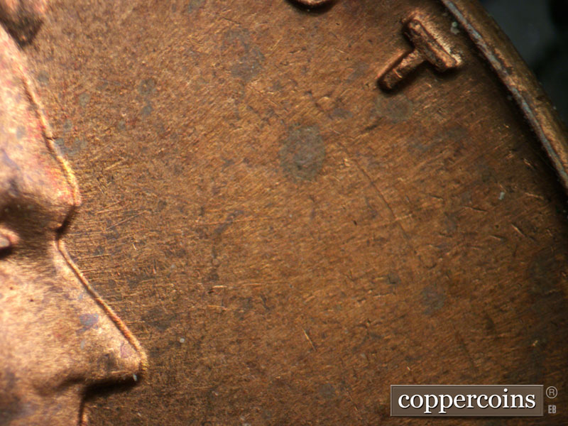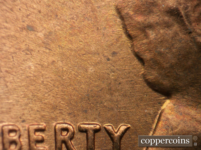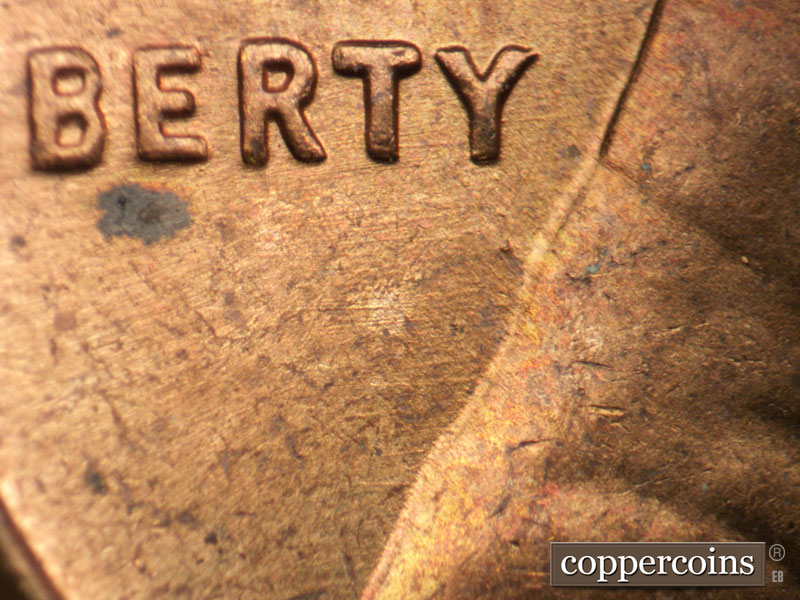 Concentric die gouge between VDB and rim heading toward L in LIBERTY. Die dot under Y in LIBERTY. ESE die scratch on neck. Reverse is MDS