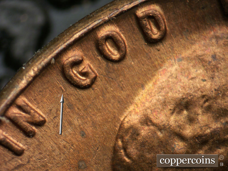 E/W die scratches cover most of obverse, see photos for exact configuration. Die gouge beside G in GOD. Reverse is LMDS.