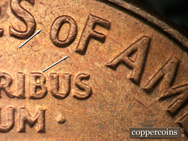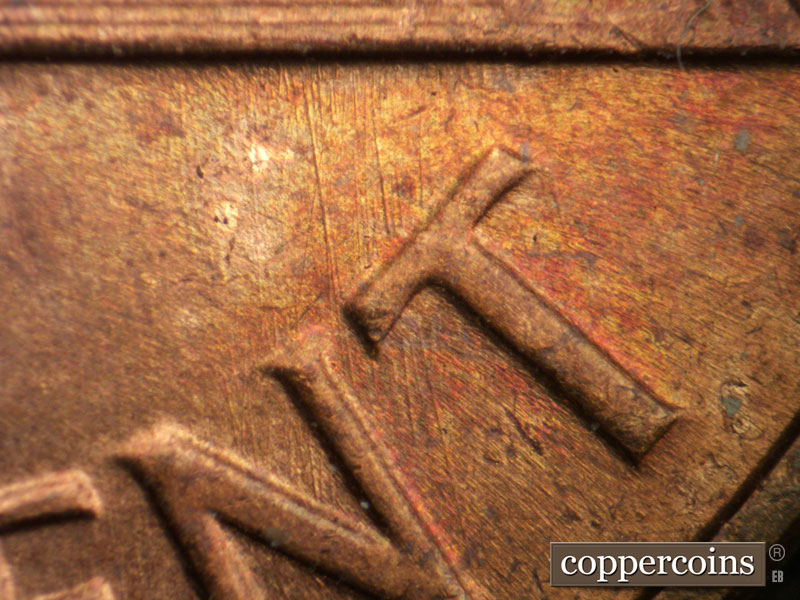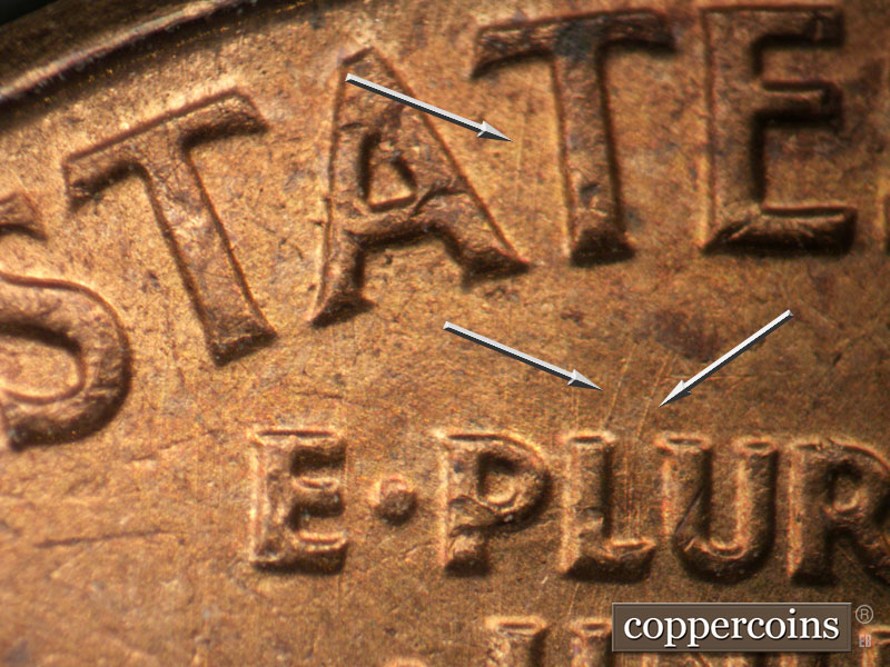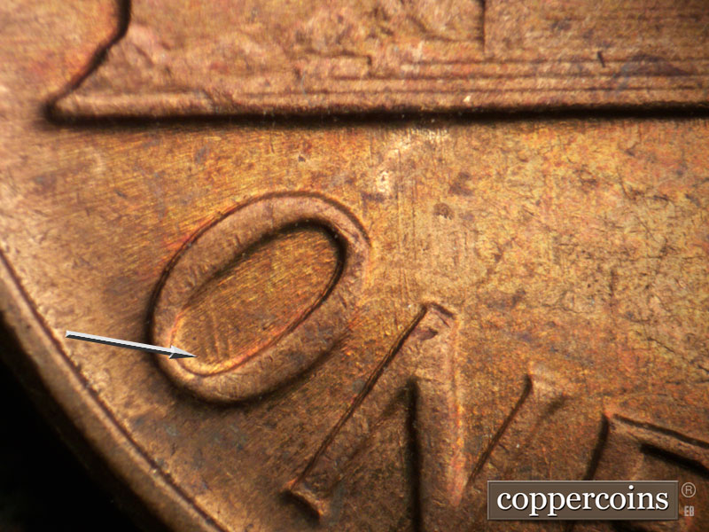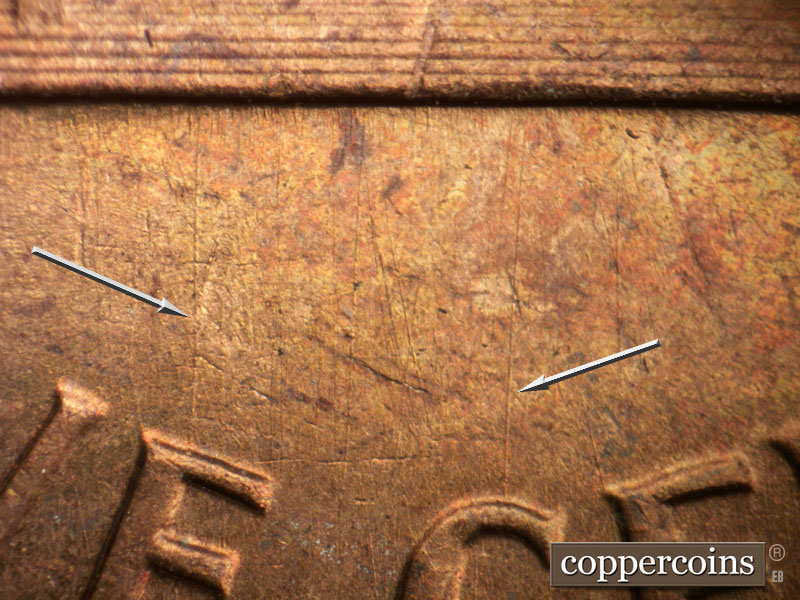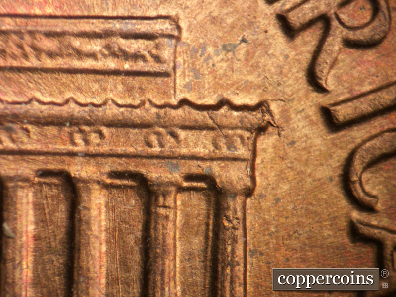 NNE die scratches from top of L in PLURIBUS. SE die scratch through O in OF. Die chip and crack on right cornice. N/S die scratches from ONE CENT.