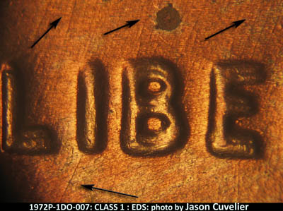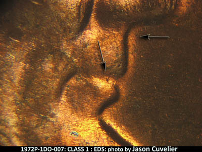 Die gouge between lips; die gouge below B of VDB near rim; curving die scratches near rim around most of the obverse, easily spotted below the bust and above WE; stronger die scratch connects the upper NW corner of the W from WE to rim; vertical to diagonal die scratches in front the the upper head and face; the same die scratches appear just below the nose and more haphazardly under TRUST; wiggly vertical die scratches near the outer folds of the jacket; numerous diagonal SW-NE die scratches through LIBERTY; a die gouge below the R in LIBERTY. EMDS Reverse