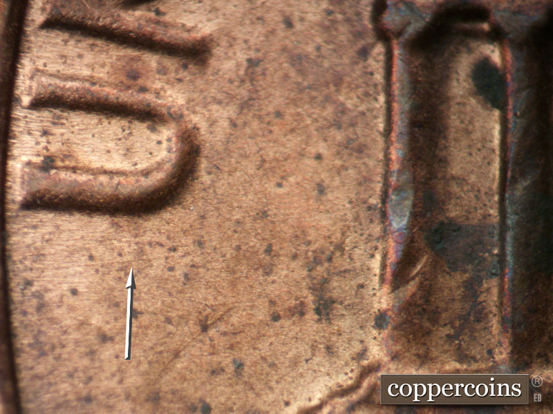 N-S die scratches in front of the forehead. Die crack through WE. SE die scratch between forehead and US in TRUST. SW die gouge between lapel and rim. Reverse is MDS
