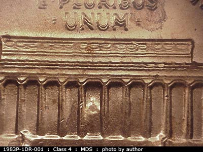 Die scratches run NE from the nose and mouth. N-S die scratches show in front of the forehead. NE-SW die scratches show behind the head and through the ERTY of LIBERTY. Obverse is MDS. Reverse