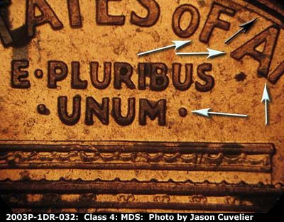 A die gouge in bay 11; apparent die damage outside of UNITED STATES of AM parallel to rim; later die states than the example shown have been reported to have a die break in the lower E of E PLURIBUS.