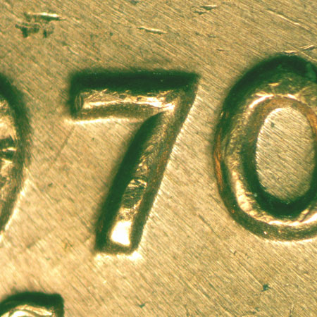 Small date: This variety shows a light spread with notching and light separation lines on TRUST. The 0 of the date also has a light separation line.