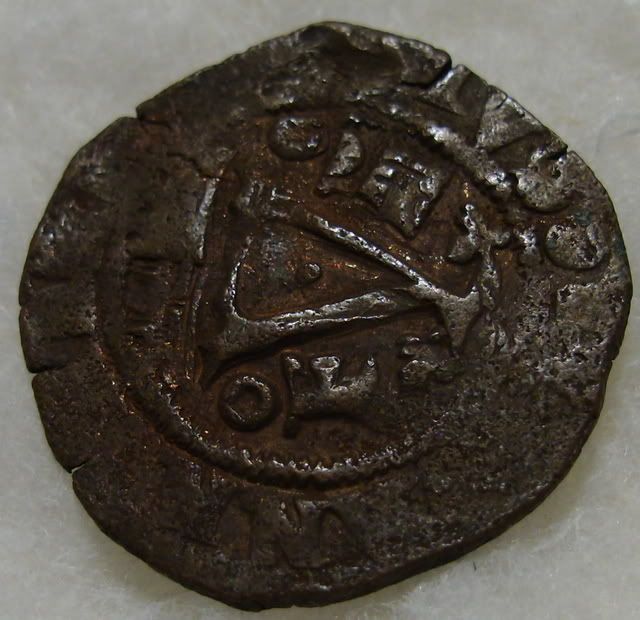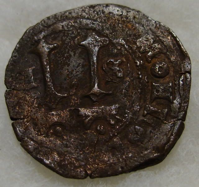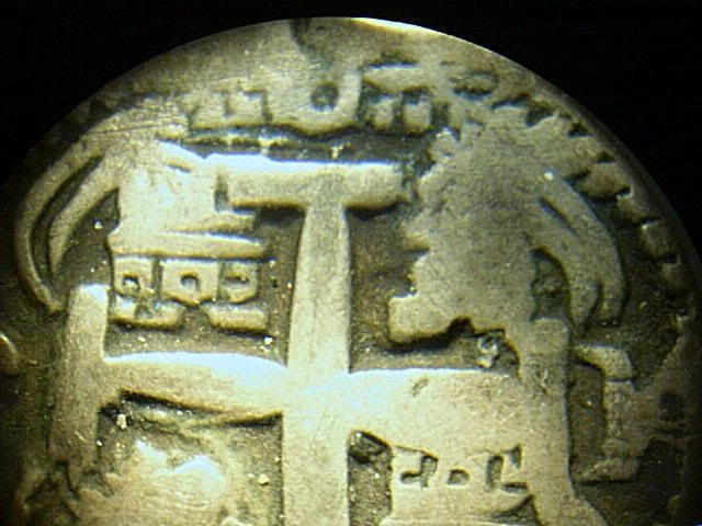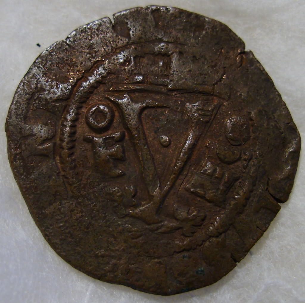 Here ia a "cob", (cabo de barra), "end of bar" that is of silver, and is 8 reales, dated 1632, and minted in San Luis Potosi. I don't know if it is authentic, or not. I have had it for more than 50 years. I don't "recognize" the two coins in the photos above. They seem to be of "Spanish origin, but for which colonies? The one with the "V" cannot be "reales, because the 8 Real coin was only broken into smaller bits: 4, 2, and 1 , then 1/2/, 1/4, 1/8. the Pillars indicate the "boundries" of the Spain, and "all outlying areas, "Plus Ultra".