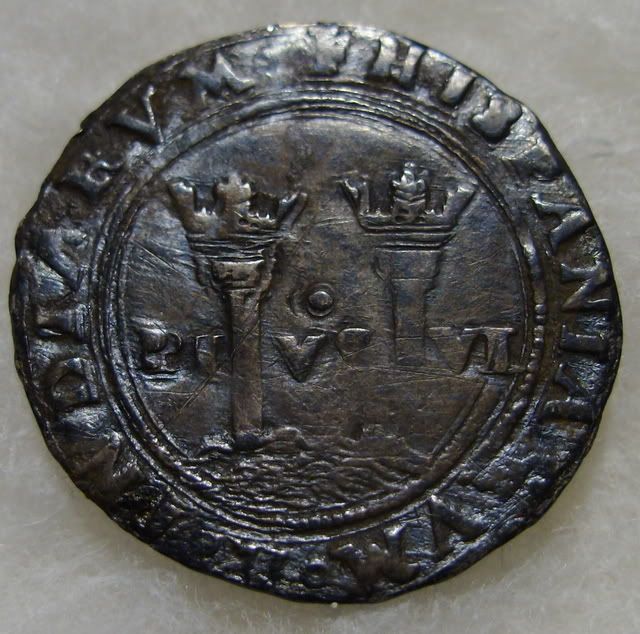 There were two series of C&J coins. The first don't have ocean waves between the columns. Yours has the waves, and is therefore the second series. That would put it from about 1542-1572.