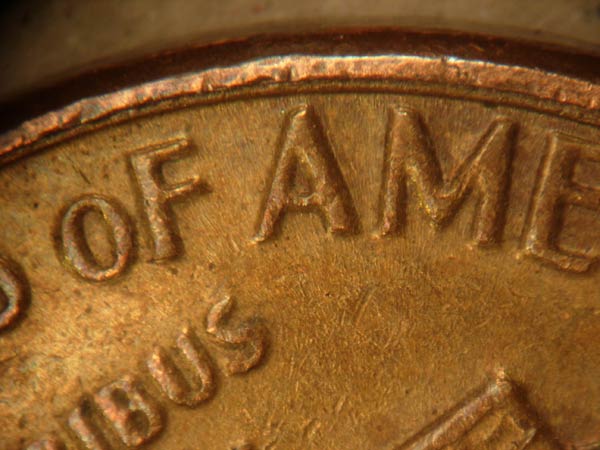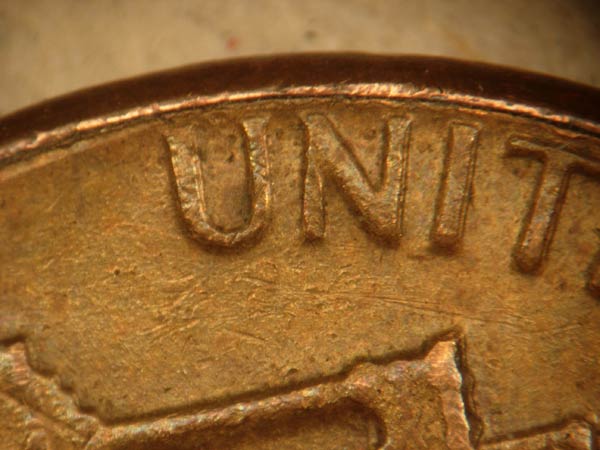 Aside from the light machine doubling on UNITED, a crease is visible along the rim in this area that looks like it may have received some work to either fit the reverse into the hole or to hide the seam: