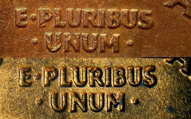 Gentlemen, At the risk of beinga big "pain", I'll try to articulate, more specifically. On the last pair of photos IE, E-PLURIBUS-UNUM. Note the letters "P", and, "UN". They have heavy dents, running paralell with each other. This is the earlier stage. Compare the letters in the next stage, (second): They look like they have been to the body shop, and are in "great shape"! Die change? If this doesn't solve the "mystery", I'll just drop it. Thank for your patience!