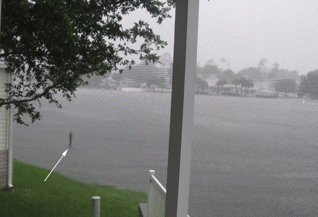 We live on a small lake, actually it is a pond and a small lake, however, it has turned into a rather medium size lake now. The post in the foreground (white arrow) is about twenty feet away from the normal shoreline. Obout half of its 5 ' is now covered in water.