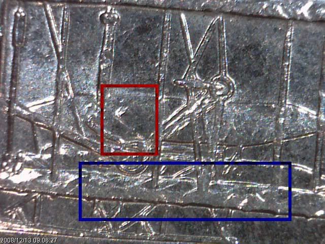 Here is an oddity that I ran across the other day. This Oregon quarter has what appears to be die scrapes (or gouges or dents) around the lower section of the smaller tree. But they form a distinct 'cloth-like' pattern -- like you expect from a strike through. But a strike through would be incused - not raised. So I'm completely stumped.