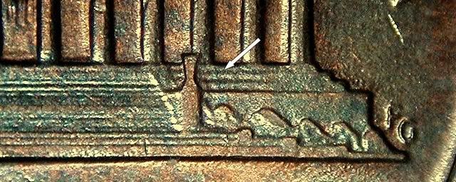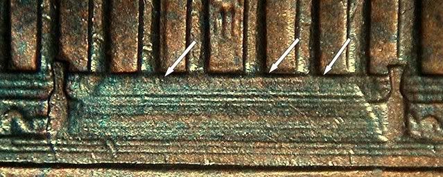 Although not very strong, it is still a very significant find for it pushes the envelope back one more year in the dates for wavy steps. This east shifted 1986-D, Lincoln cent wavy step die has a strong fluting line extension under column # 10 with light step deviation under columns # 6, 7 and 8. If there was one defining characteristic that convinced me that this was in fact a wavy step, it was the offset angle of the fluting line from south, whch was 20 degrees, a common offset angle found in the majority of wavy steps.
