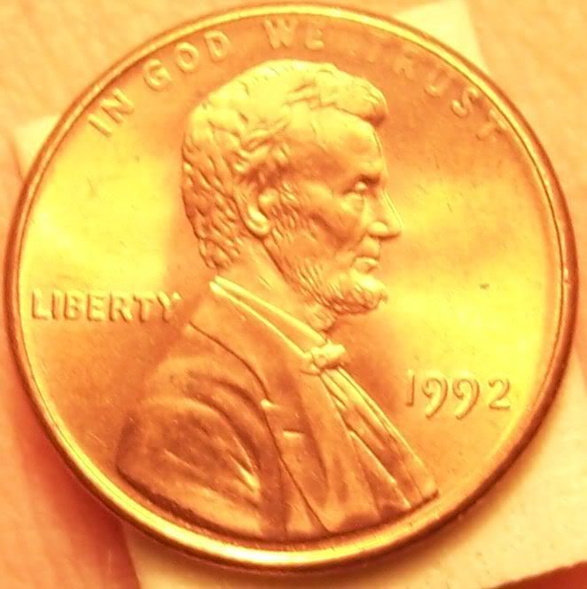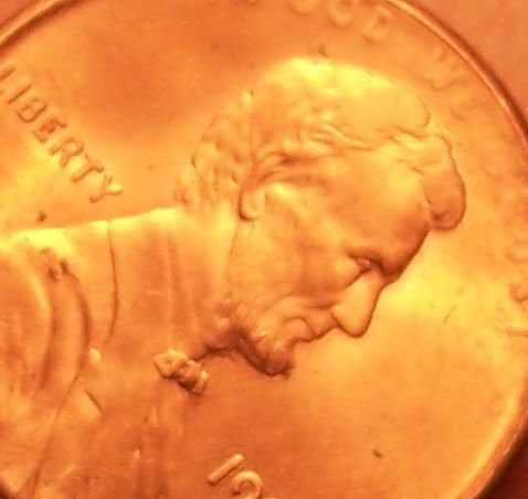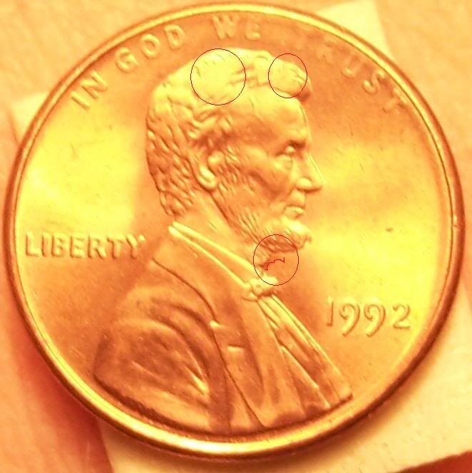 I found this while searching some rolls a few minutes ago and was wondering if it is indeed a die clash. The first picture is a shot of the obverse and the second is the closeup. Right above the bowtie beside the neck it looks like a clash of the corner of one of the pillars on the memorial which coincides with an overlay that coop made in another post. The second odd feature and its kinda hard to tell from the pic, is what appears to be a double beard or something similar...its a somewhat rectangular area on the upper half of the beard, definitely not supposed to be there, at least not to the degree that it is. One more thing to note is the hair has to fairly large spots that are smooth, kinda like they have been polished smooth, and the "WE TRUST" is also very light. Please excuse the last 2 images they are horrendous but i figured i would try and "outline" the areas in question..i think i failed horribly.