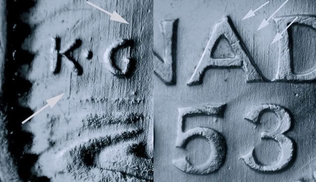 I don't refute that some of the effects we are seeing are caused by the hubbing process, but this particular case appears to be nothing more than over zealous die polishing with some sort of tool that spins and has bristles - like some sort of spinning wire brush.