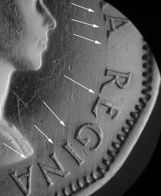 Notice the die scratches through the designers initials. They travel in a north / south direction. So do the polishing lines from the second A in CANADA. The trails are in a 050 direction. Also, one only needs to look at the trail line from the top of the 5 digit and the polishing marks to see the marked difference between them.
