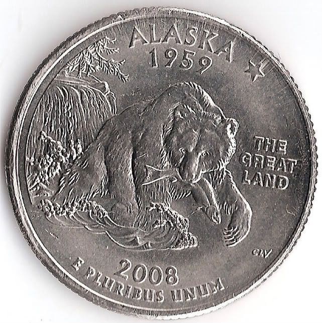 Anways my findings, a 1942 wheat a 1940 Jefferson, a 1964 Silver dime and at least a 20- 60's Lincolns.(I know for sure 1 RPM, need to compare first) By the way Dick one guy came in and paid me w/ 4 Alaska quarters. I'd be happy to send one to ya & might have the other quarters you need as well, I'll check Smile