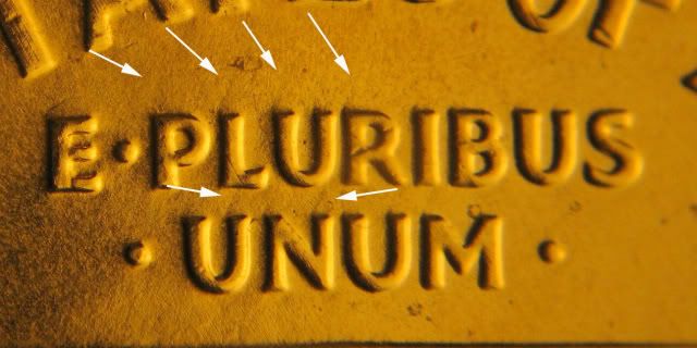 While attributing some 2006D Lincoln cent trail dies, I noticed that three different dies had the same markings on the letters of the EPU. Take a look at the picture below.