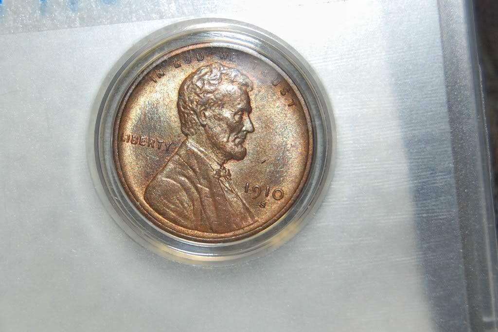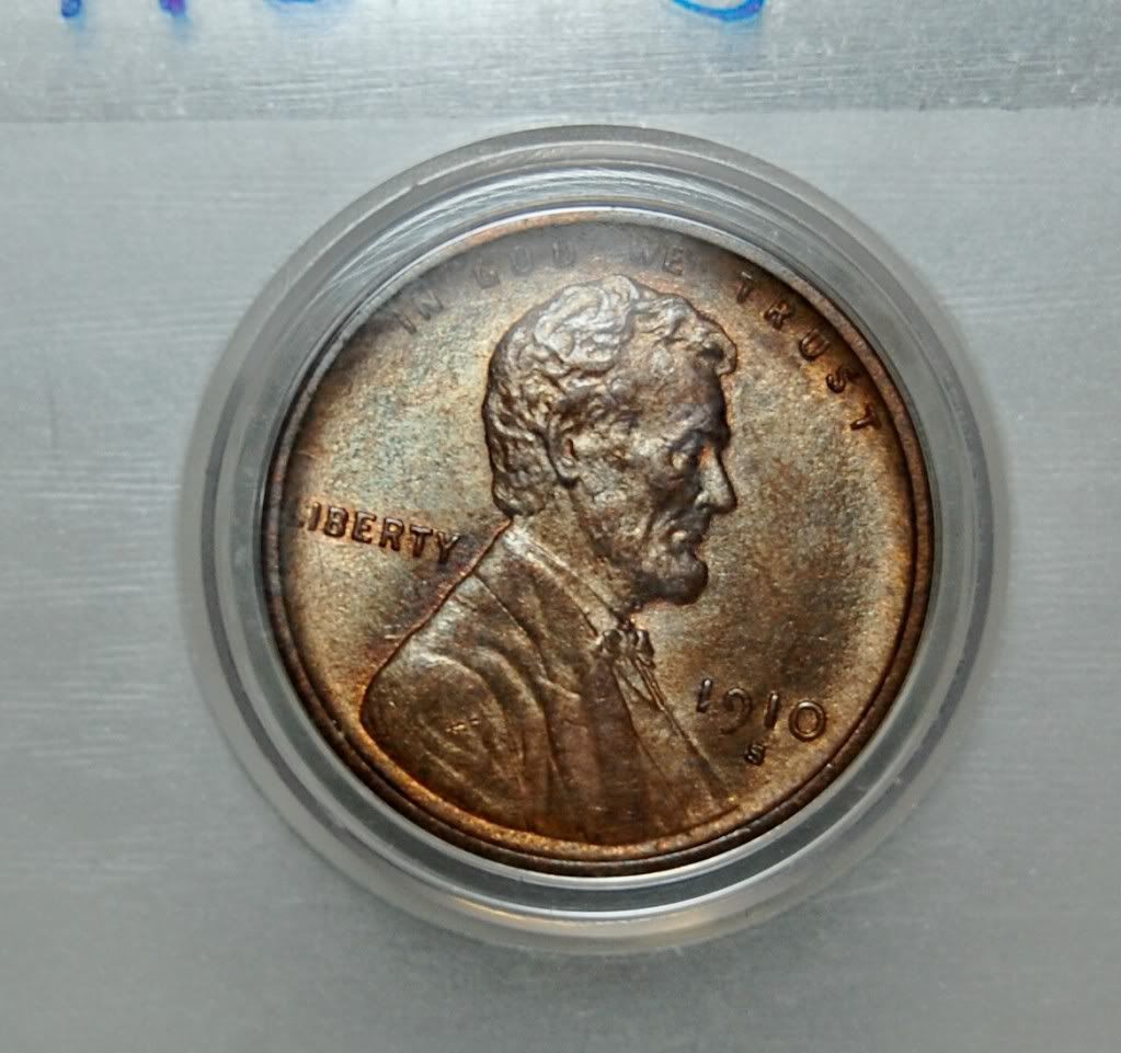 Would like an opinion of this 1910-S I recently purchased want to see if my grade is close.couple of photos show a dark spot in front of lincolns chin it is a piece of lint on the holder casting a shadow.