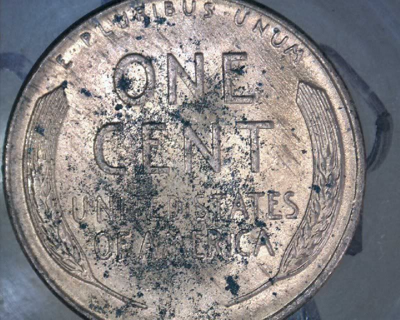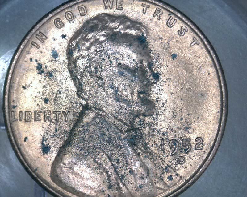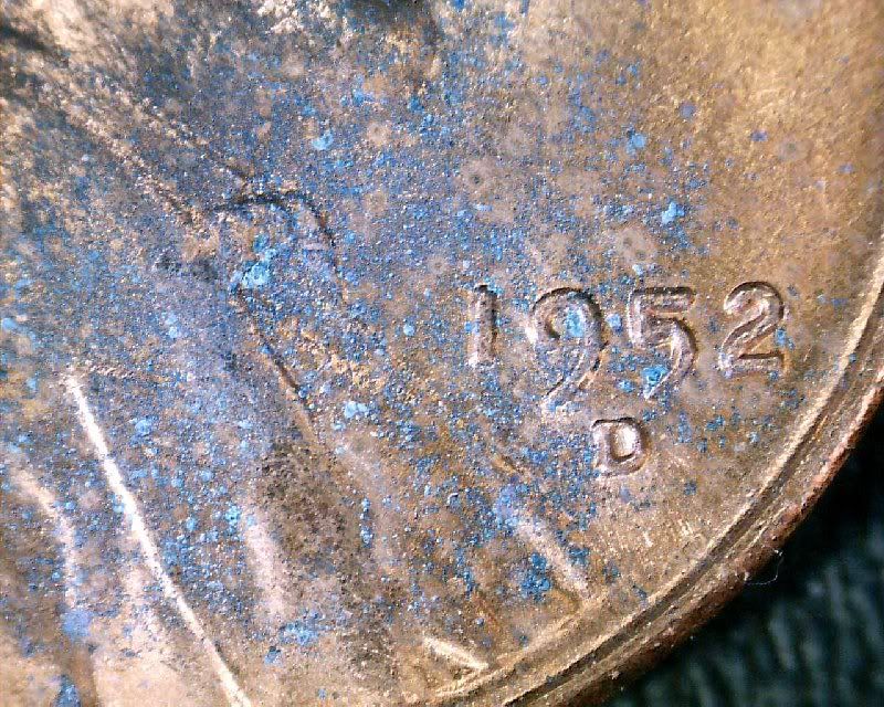here is the 1952D wheat, Im afraid after looking closer and advancing the hue of the image, the coin is seriously pitted, the pits have a copper oxide color (blue green) so it is goner, worth its weight in copper