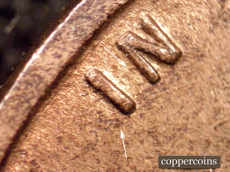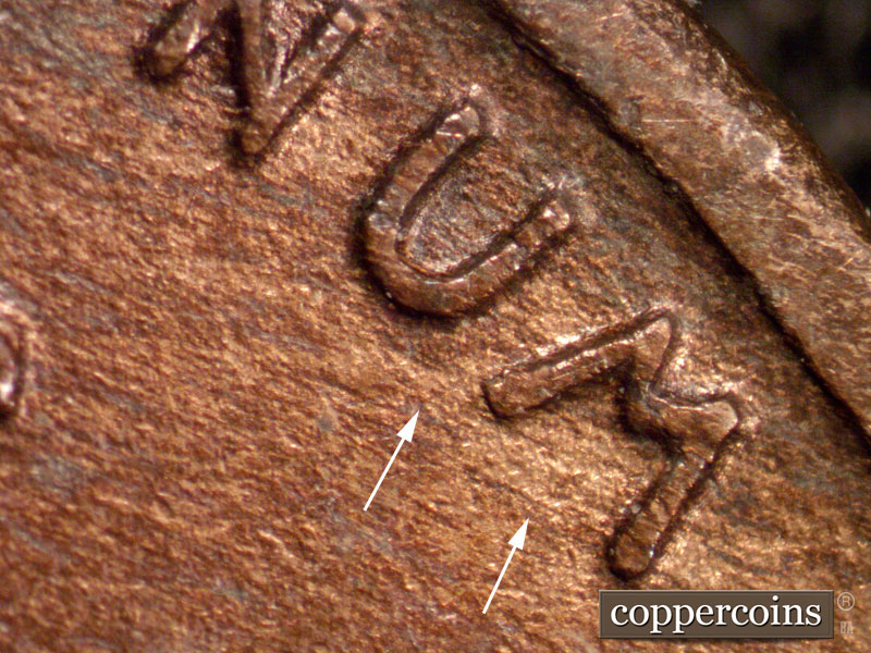 Two parallel die scratches in center of M of UNUM, long N-S die scratch inside loop of C of CENT