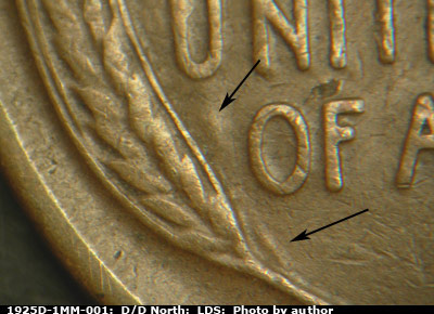 Die clash marks show to the east of the lower left wheat stalk. A short E-W die crack between the A and T of STATES. A die gouge next to the T of CENT. Reverse is LDS.