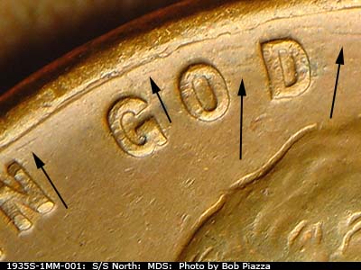 Die scratches protrude from the top and bottom of the 1 in the date. A die gouge (dot) below the T of LIBERTY. Die scratches run N-S through LIBERTY. Die scratches between the rim and IN GOD.