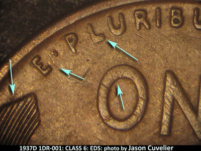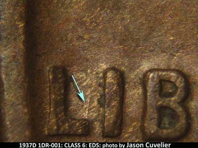 Strong extra thickness can be seen on the motto, the dots, the outside wheats and on the top of ONE. The obverse shows a repunched mintmark. It is identified as 1937D-1MM-001.