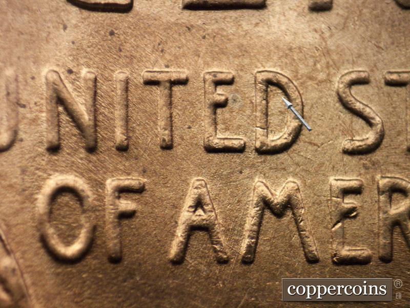 Die crack on lower C in CENT. Light SSW die scratching through AM in AMERICA. Small die gouge upper inside D in UNITED.