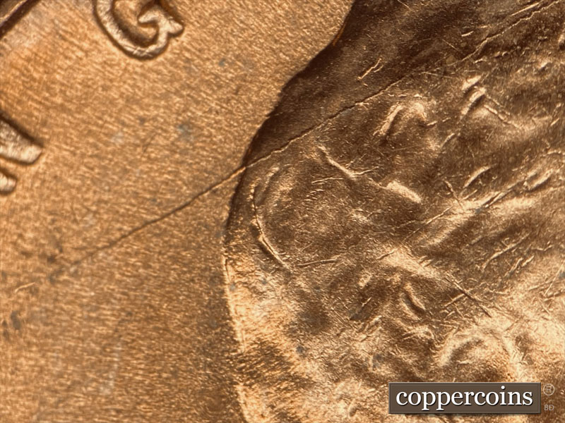 A die gouge can be found inside lincolns ear. A die crack can be found in between E of WE and T of TRUST running S/W through lincolns hair to just below IN. Multiple die gouges can be found in lincolns hair around the die crack. A die crack can be found By the 1 of the date running S/W through the lapel and into the rim. A die scratch can be found running from the bottom tip of the 9 to the lapel. A die crack can be found on the top of the 0 of the date running N/E to the rim.