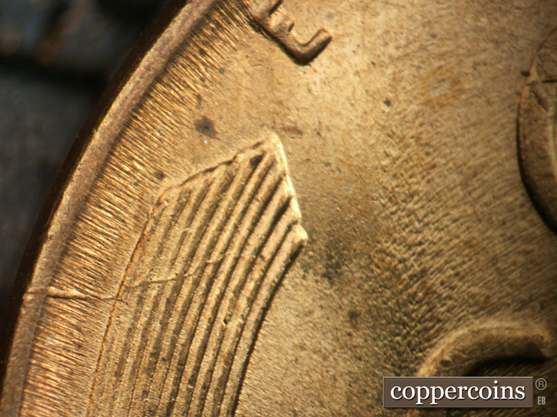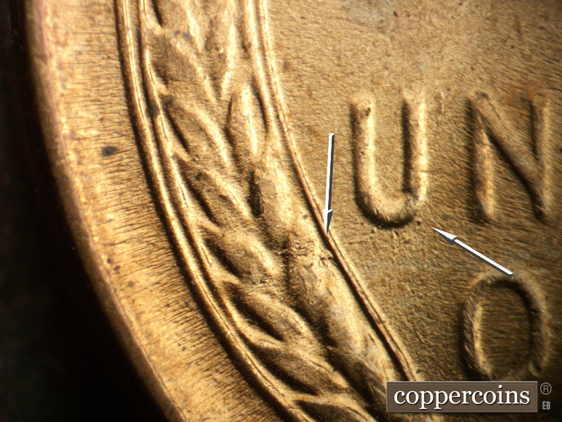 Die crack through upper left wheat stalk. Die dot near U in UNITED. Die chip in left wheat stalk west of U in UNITED.