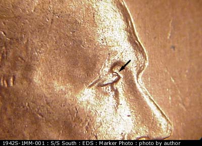 A nice extra left curve shows at the lower serif of the primary mintmark as well as an extra serif to the south of the primary mintmark. There is also a split in the lower serif. This die is also listed as 1942S-1DO-001/FS-101. Old CPG #018.94