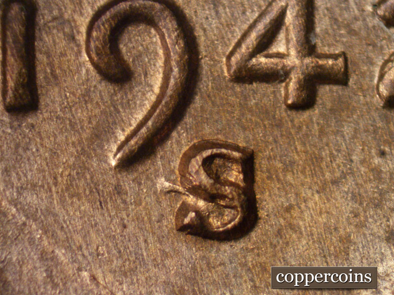 The center of the secondary mintmark can be seen widely spread to the west, touching the left curve of the primary mintmark.