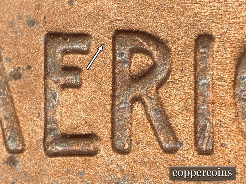 A die scratch can be found running through the bottom curve of the S in STATES. A die scratch can be found running E/W above the E in CENT. A die scratch can be found running SE through the R in AMERICA.