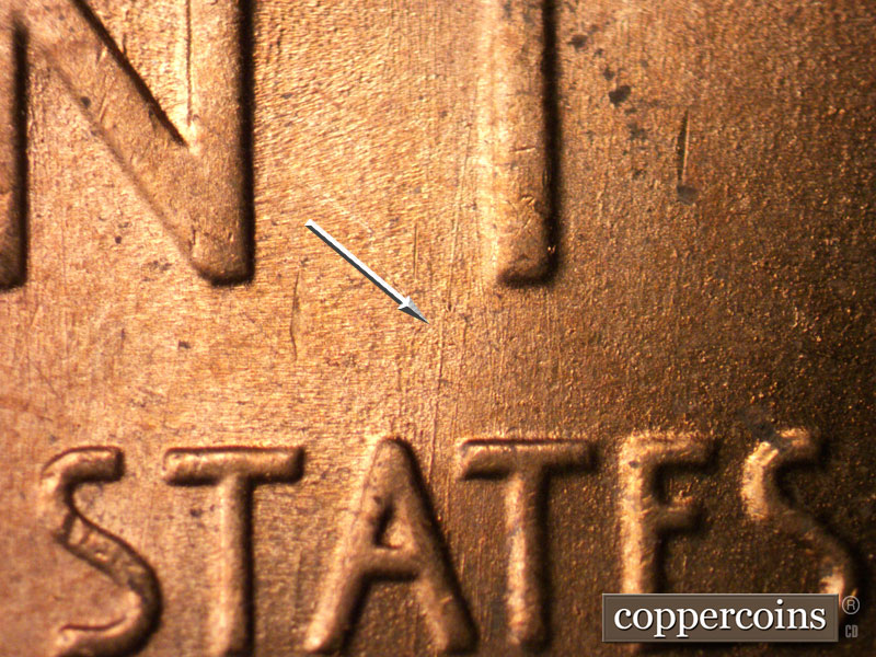 SSE die scratch from E in E PLURIBUS. Die dot just above N in ONE. SSW die scratch connect T in CENT to A in STATES.