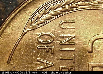 Heavy N-S die scratches show around the UNI of UNITED and OF. Other N-S die scratches show inside the right wheat stalk. Reverse is MDS.