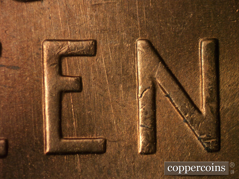 A die crack runs NW from the top left corner of the E in ONE. Two heavy N-S die scratches show in the field inside the left wheat. Another N-S die scratch shows inside the C of CENT. Reverse is LDS.