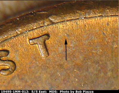 Split serifs show on this repunched mintmark. This die also exhibits a doubled die obverse identified as 1949S-1DO-002. This variety shows a blunt top 4 over pointed top 4 in date and is very similar to 1949S-1DO-001.