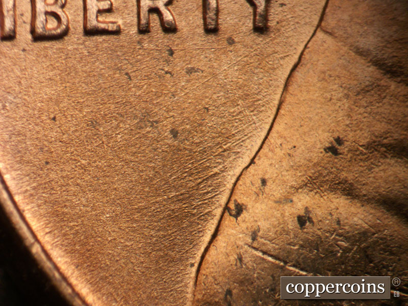 Die gouges through UNUM. Concentric die scratches under ERICA in AMERICA. NE die scratch in C of CENT.