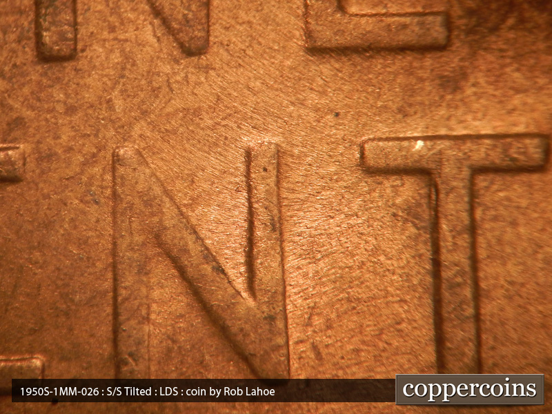 Die flow markers can be found around the N & T of CENT. Die flow lines are seen above the C of CENT.