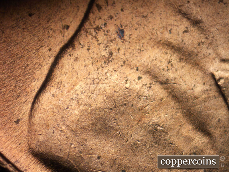 Die crack over VDB and on shoulder. Die gouge behind jacket. Light die crack in hair. SSE die gouge in front of nose. Reverse is MDS